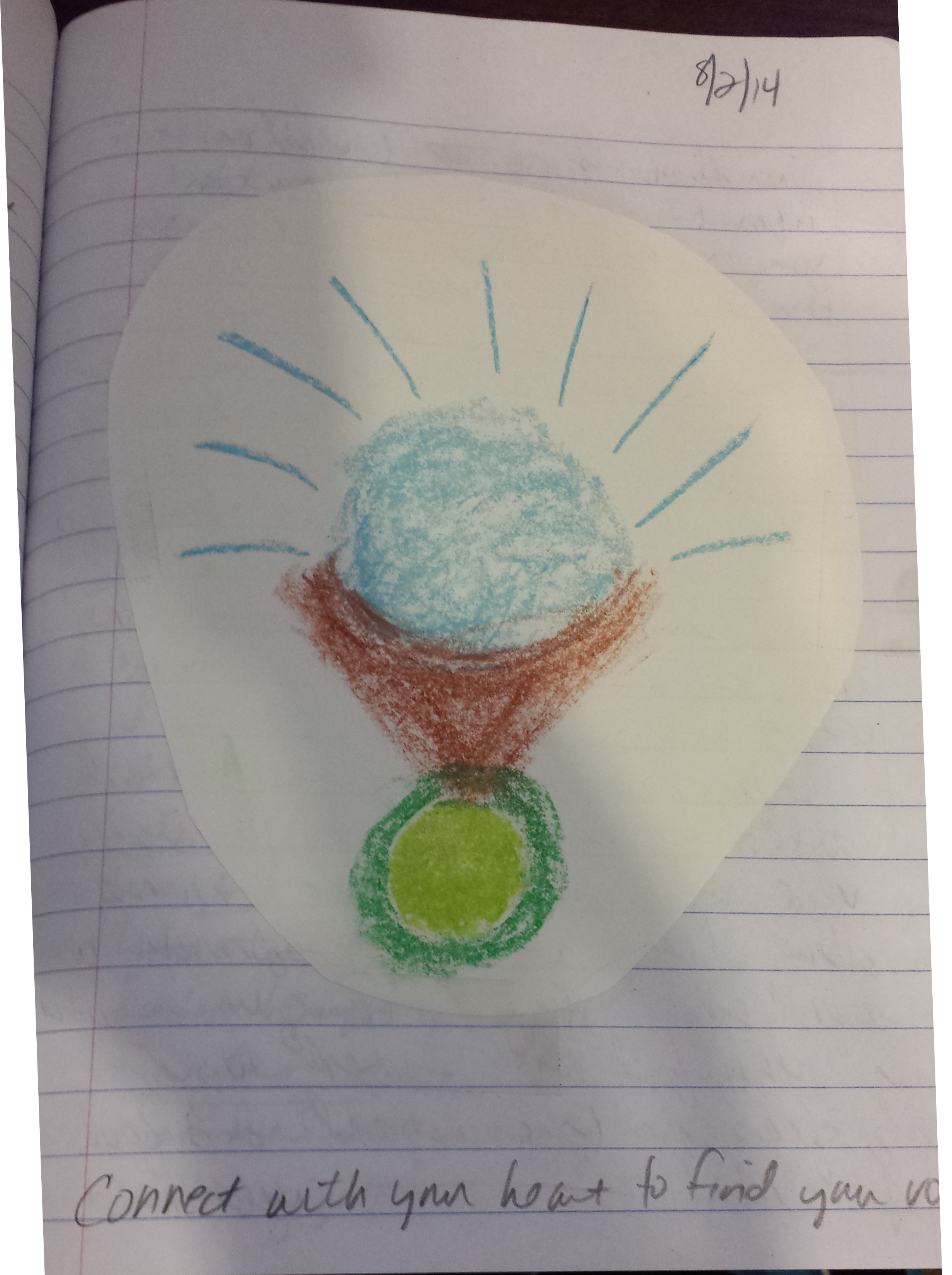 In the “connection” part, my attention was drawn to my throat, which the chakra meditation advises is represented by the color blue. But at the bottom of my throat area, I felt a heaviness or a pulling, which I translated into the brown brace underneath. As I continued to play with the pastels, the brace became more pointed at the bottom, like it was being weighted down. In the chakra meditation, the heart chakra is represented by the color green, which became the green circle. But it felt guarded and restricted, and I added the darker green “protective barrier” around it.